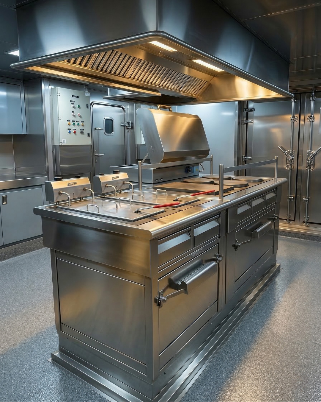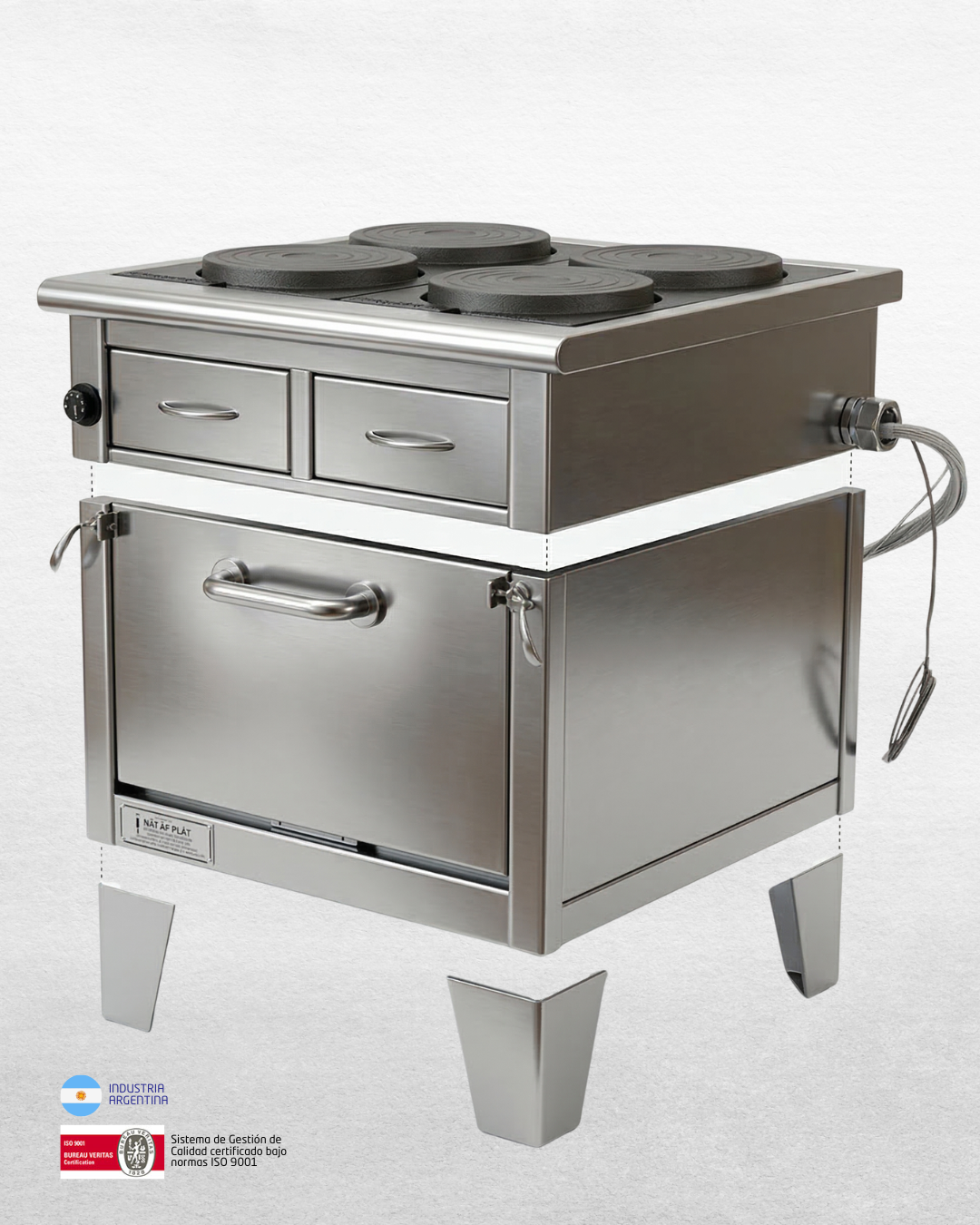 Cocina eléctrica diseñada para uso a bordo, con estructura robusta en acero inoxidable AISI 304 y sistema de calentamiento mediante resistencias blindadas tubulares, garantizando eficiencia térmica y larga vida útil en aplicaciones navales.